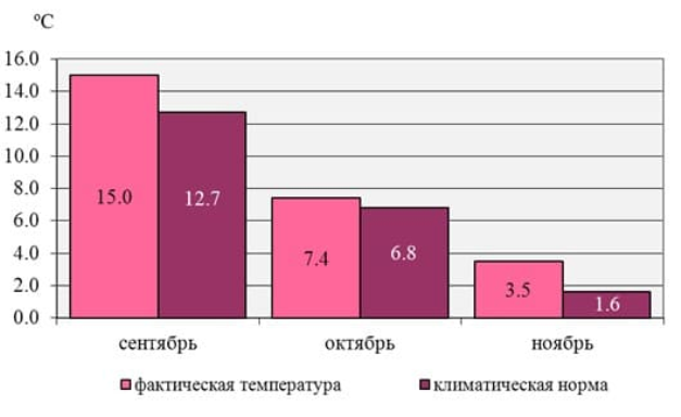 Сярэдняя тэмпература паветра за ўсіх восеньскіх месяцаў была вышэй за норму.