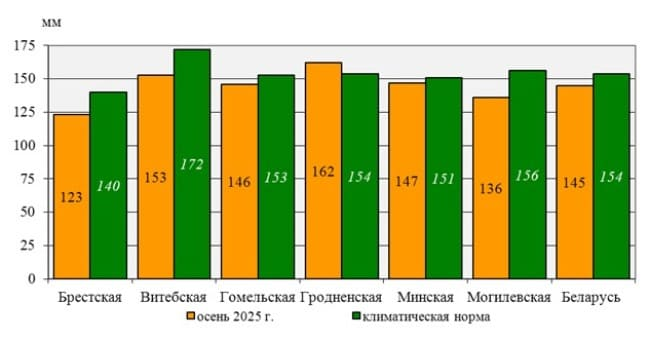 Колькасць ападкаў за восень 2025 года і кліматычная норма