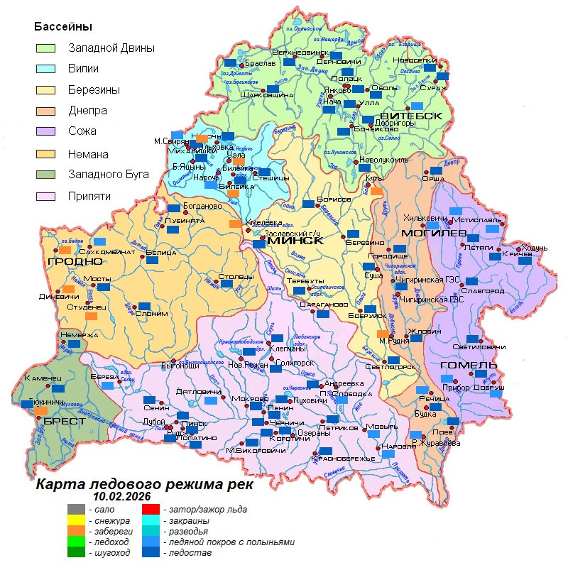 Па стане на 10 лютага на рэках краіны назіраецца ледастаў таўшчынёй 8-39 см, месцамі ў ледзяным покрыве адзначаюцца палонкі.