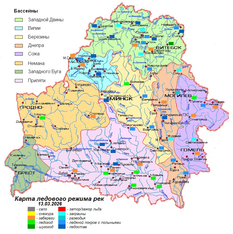 Па стане на 13 сакавіка на большасці рэк басейна Заходняй Дзвіны, на Дняпры, большым працягу Бярэзіны, а таксама на асобных участках Віліі і Сожа яшчэ назіраецца ледастаў з палонкамі, закраінамі і разводдзямі. Крыгаход назіраецца на Нёмане ў г. Масты, Бярэзіне ў г.Барысаў, а таксама на Прыпяці і асобных яе прытоках.
