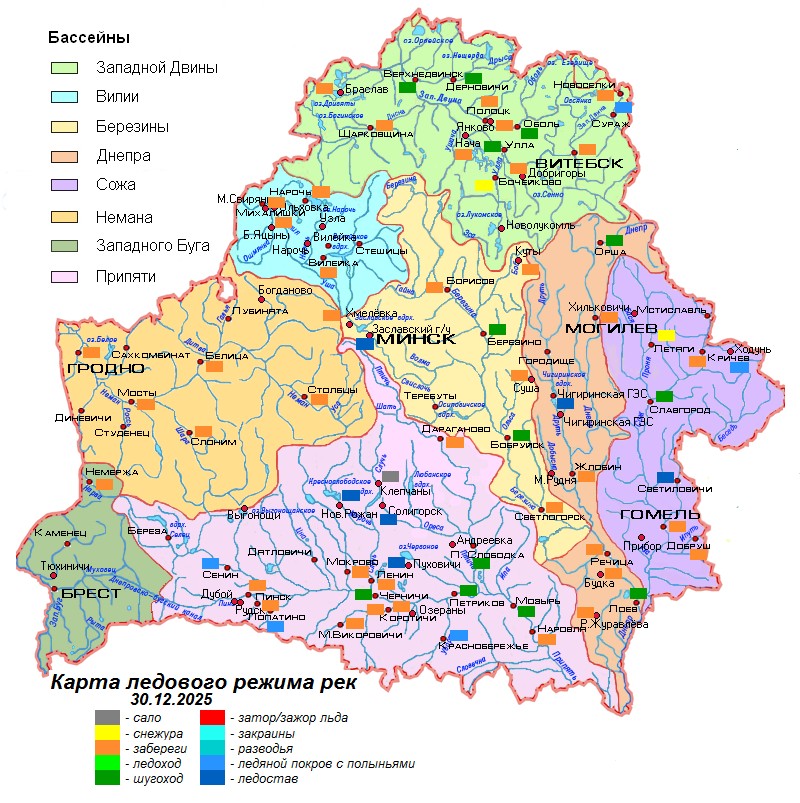 Па стане на 30 снежня амаль паўсюдна на рэках назіраюцца шугаход і забярэгі, ледастаў і ледастаў з палонкамі адзначаецца на Заходняй Дзвіне ў г.п.Сураж, а таксама некаторых прытоках Сожа і Прыпяці. На вадасховішчах Чыгірынскае, Заслаўскае, Салігорскае, Чырвоная Слабада і возеры Чырвонае ўсталявалася тонкае ледзяное покрыва, на азёрах Нарач і Дрывяты назіраюцца забярэгі.
