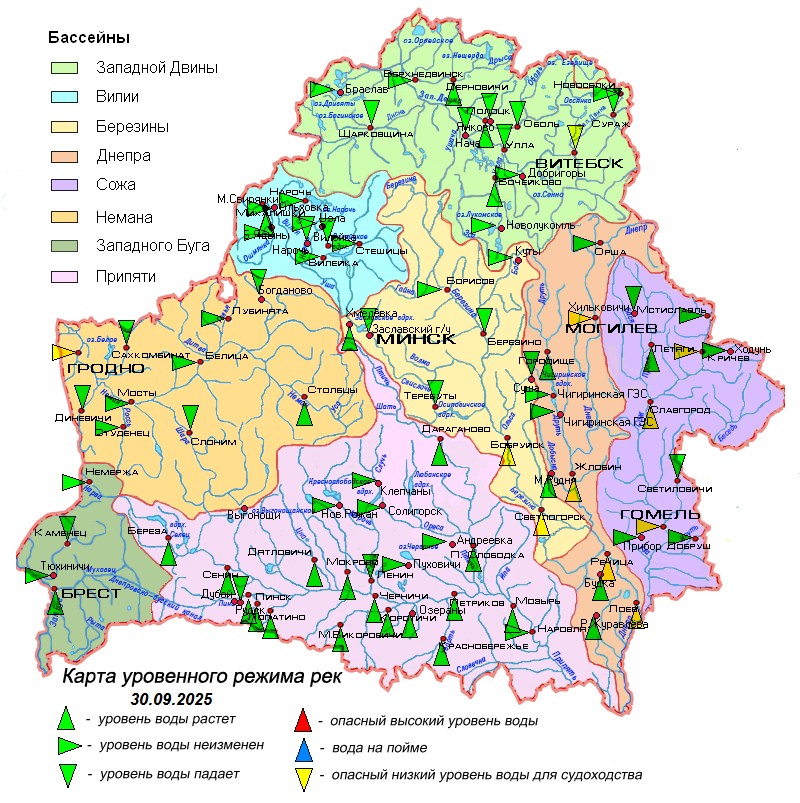 Па стане на 30 верасня на рэках краіны назіраюцца ваганні ўзроўняў вады з інтэнсіўнасцю 1-21 см за суткі.