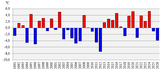Deviation of the average February air temperature for the period 1991-2026