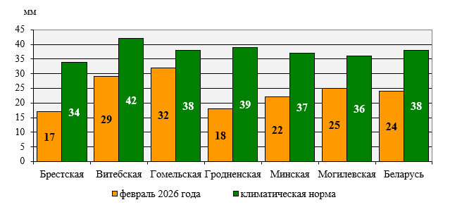 During the month, an average of 24 mm of precipitation fell in the republic, which amounted to 63% of the climatic norm. Such dry conditions in February occur approximately once every 4-5 years. The driest February was in 1972, when only 8 mm of precipitation fell during the month. Over most of the country, 40-70% of the normal precipitation fell.