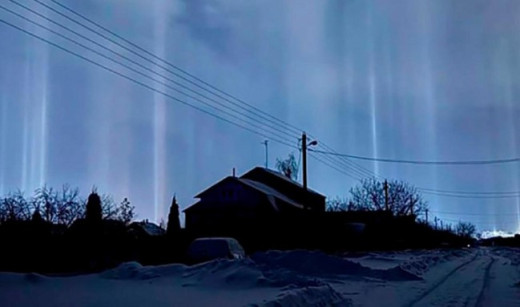 Специалисты считают, что такой визуальный эффект мог возникнуть из-за того, что в воздухе находились мелкие снежинки. Кристаллики снега образуют гало, когда свет от луны или фонарей преломляется в них, создавая светящиеся столбы или дуги. Это происходит при определенных погодных условиях.