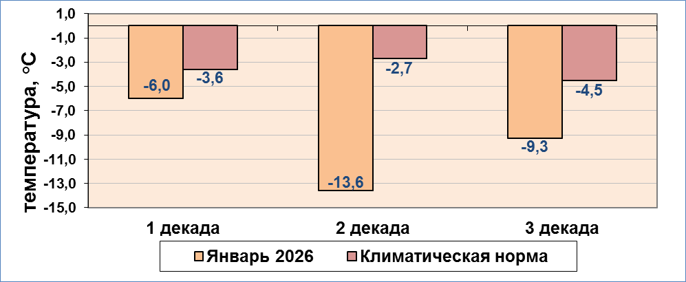 Средняя температура воздуха всех трех декад месяца была ниже нормы. Наиболее холодной выдалась вторая декада января, когда отклонение от нормы составило -10,9°С.