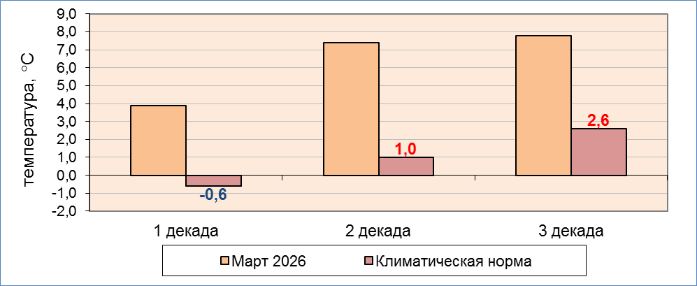 Средняя температура воздуха и климатическая норма по декадам марта 2026 года по Гродненской области