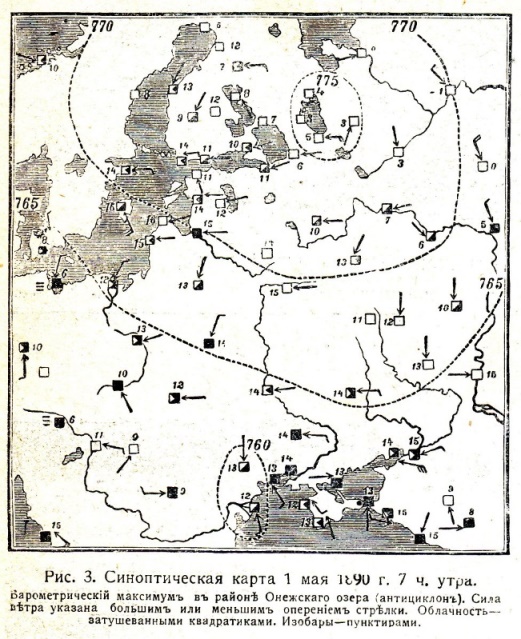 На первой карте были нарисованы линии равного давления - изобары, и обнаружилось, что линии имеют замкнутую форму и очерчивают области высокого и низкого давления. Благодаря новому открытию, учёные поняли, что именно перемещение воздушных масс в областях низкого (циклоны) и высокого давления (антициклоны) формирует погоду на Земле.