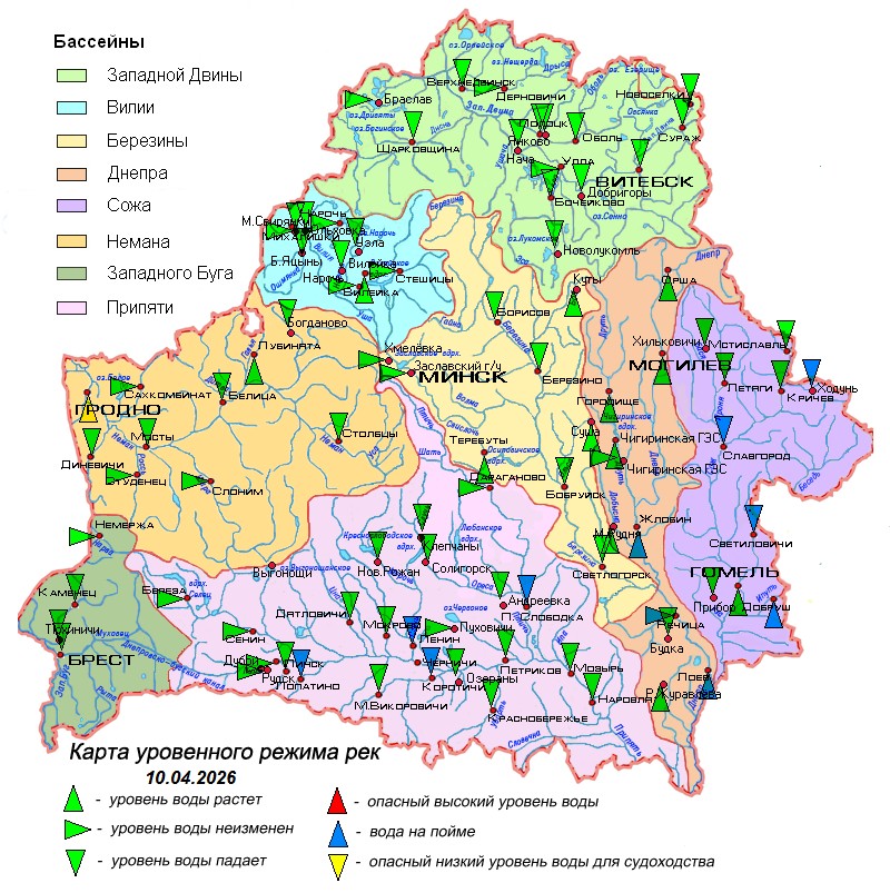 По состоянию на 10 апреля рост уровней воды с интенсивностью 1-5 см за сутки наблюдается на Днепре, Немане у г.Гродно, Соже у г.Гомель, отдельных их притоках и некоторых притоках Березины. На остальном протяжении указанных выше рек, а также на Западной Двине, Вилии, Березине и Припяти отмечается спад уровней воды с суточной интенсивностью до 16 см.