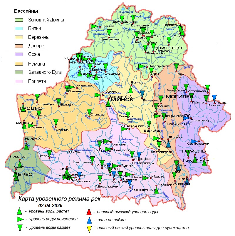 По состоянию на 2 апреля рост уровней воды с интенсивностью 1-12 см за сутки наблюдается на большем протяжении Днепра, отдельных участках Немана, Березины, Сожа и Припяти, некоторых их притоках, а также на отдельных притоках Западной Двины и Вилии.