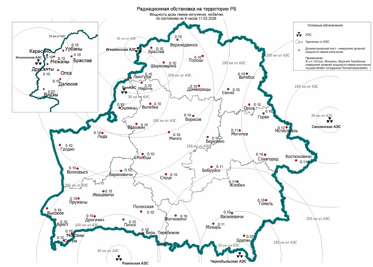 По состоянию на 11 февраля 2026 года уровни мощности дозы гамма-излучения в Бресте, Витебске, Гомеле, Гродно, Минске – 0,10 мкЗв/ч, в Могилеве – 0,11 мкЗв/ч, что соответствует установившимся многолетним значениям.