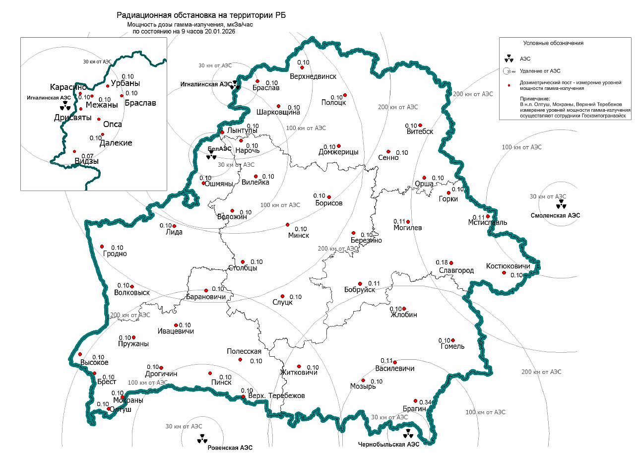 По состоянию на 20 января 2026 года уровни мощности дозы гамма-излучения в Бресте, Витебске, Гомеле, Гродно, Минске – 0,10 мкЗв/ч, в Могилеве – 0,11 мкЗв/ч, что соответствует установившимся многолетним значениям.
