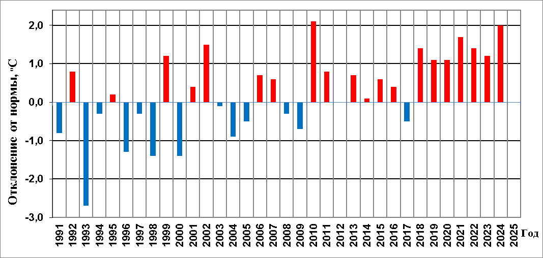 Средняя по области температура воздуха летнего сезона 2025 года составила +17,6 °С, что является климатической нормой и на 2 °С холоднее, чем в прошлом году. За минувшее лето отмечено от 1 до 4 очень жарких дней (с температурой +30 °С и выше) при норме 1-8 дней, что на 1-11 дней меньше, чем прошлым летом.
