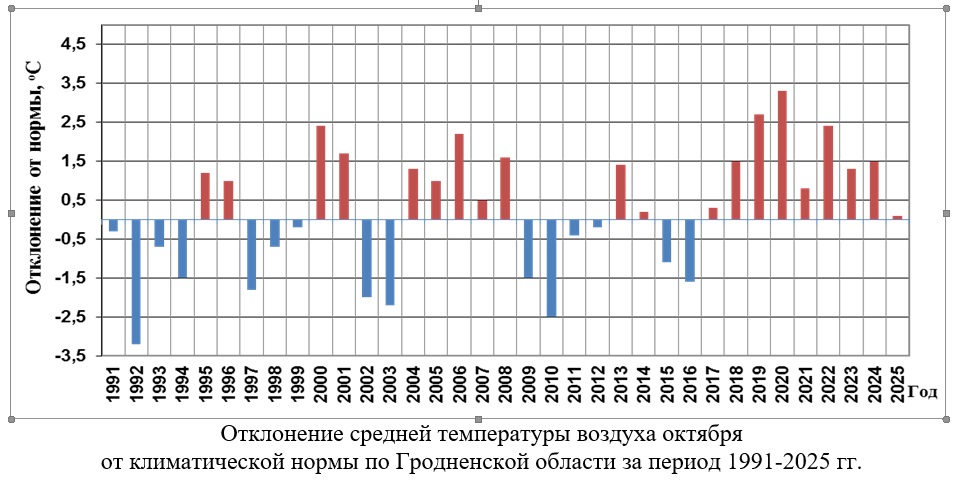 Средняя температура воздуха за октябрь по Гродненской области составила +7,1°С, что около климатической нормы.