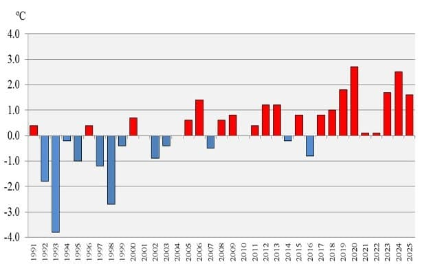 Сярэдняя па краіне тэмпература паветра за восеньскі сезон 2025 года была на 1,6°С вышэй за кліматычную норму і склала +8,6°С. За пасляваенны перыяд такая цёплая восень адзначана ў шосты раз, а самай цёплай яна была ў 2020 годзе з сярэдняй тэмпературай 9,7°С.