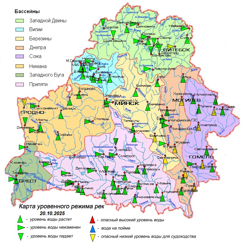 Па стане на 20 кастрычніка на рэках краіны адзначаецца рост узроўняў вады з інтэнсіўнасцю да 18 см, абумоўлены выпадзеннем ападкаў. Нязначны спад узроўняў вады назіраецца толькі на Заходняй Дзвіне ў аг.Ула і Нёмане ў г.Гродна.