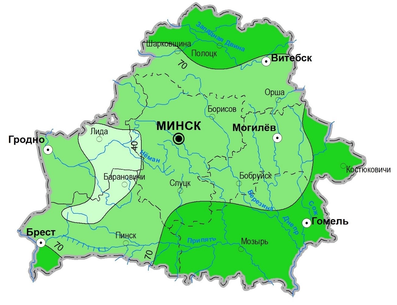 By region the largest negative temperature deviations from the climatic norm were recorded in the Vitebsk region (average for the region 4.3°C), and the smallest in the Brest region (average for the region 3.3°C).