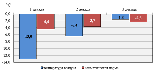 The first decade of the month was very cold with an average air temperature in Belarus of -13.0°C, which is 8.6°C below the climatic norm. The average air temperature in the second decade was also below the climatic norm, by 2.7°C. The third decade was 0.7°C above the norm.