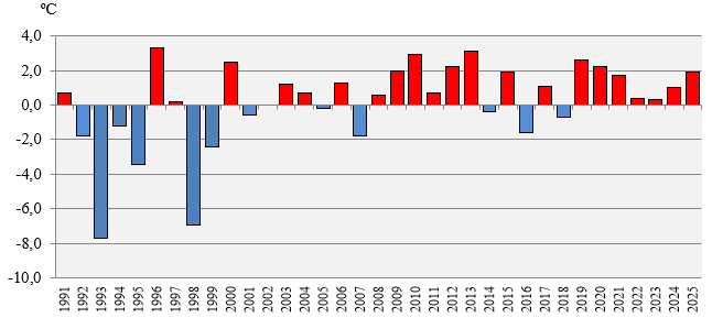 from the climatic norm for the period 1991-2025 (+1.6°C)