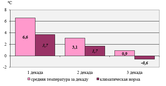 The average air temperature in all three decades of the month was above normal.