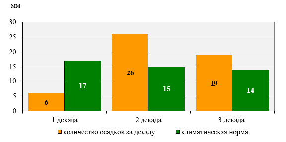 Precipitation fell unevenly during the month. There was a shortage of moisture in the first decade of the month, with an average of 35% of the national precipitation rate. In the second and third decades, excessive moisture was noted (175% and 139% of the norm fell, respectively).