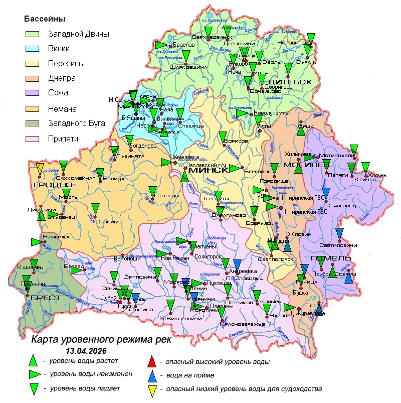 As of April 13, a rise in water levels with an intensity of 1–4 cm per day is observed along most of the Dnieper River, the Sozh River near Gomel, some of their tributaries and on certain tributaries of the Neman River. On the remaining stretches of the aforementioned rivers, as well as on the Western Dvina, the Viliya, the Berezina and the Pripyat Rivers, a decrease in water levels is occurring, with a daily intensity of up to 24 cm.