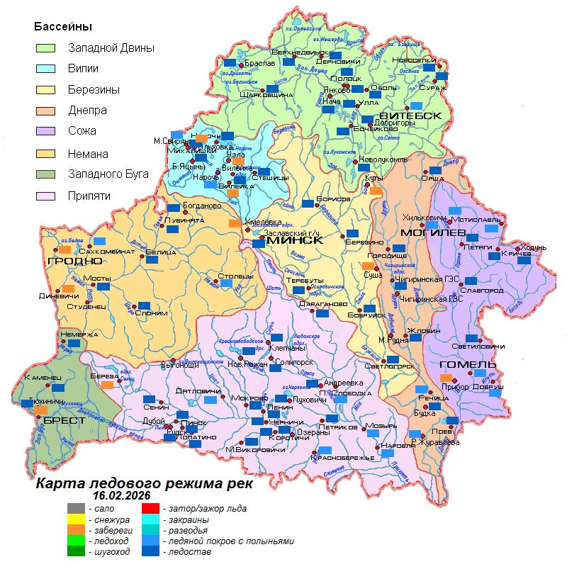 As of February 16, rivers across the country are primarily characterized by a stable ice cover and an ice cover with openings (leads), with ice thicknesses ranging from 10 to 45 cm.