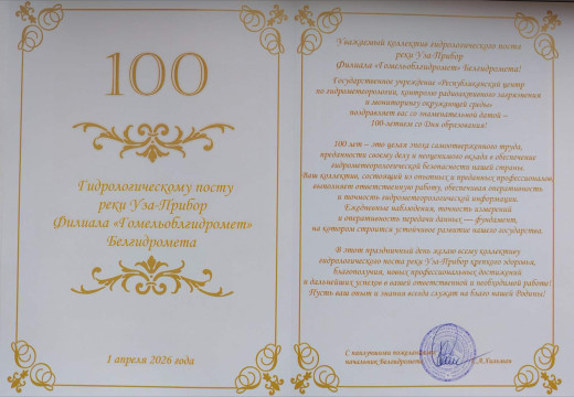 По случаю 100-летия со дня образования гидрологического поста р. Уза-Прибор руководство Белгидромета направило приветственный адрес коллективу поста, в котором поздравило его с этой знаменательной датой, отметив опыт и профессионализм работников, их вклад в обеспечение гидрометеорологической безопасности нашей страны, и высказало тёплые пожелания здоровья, благополучия, успехов!