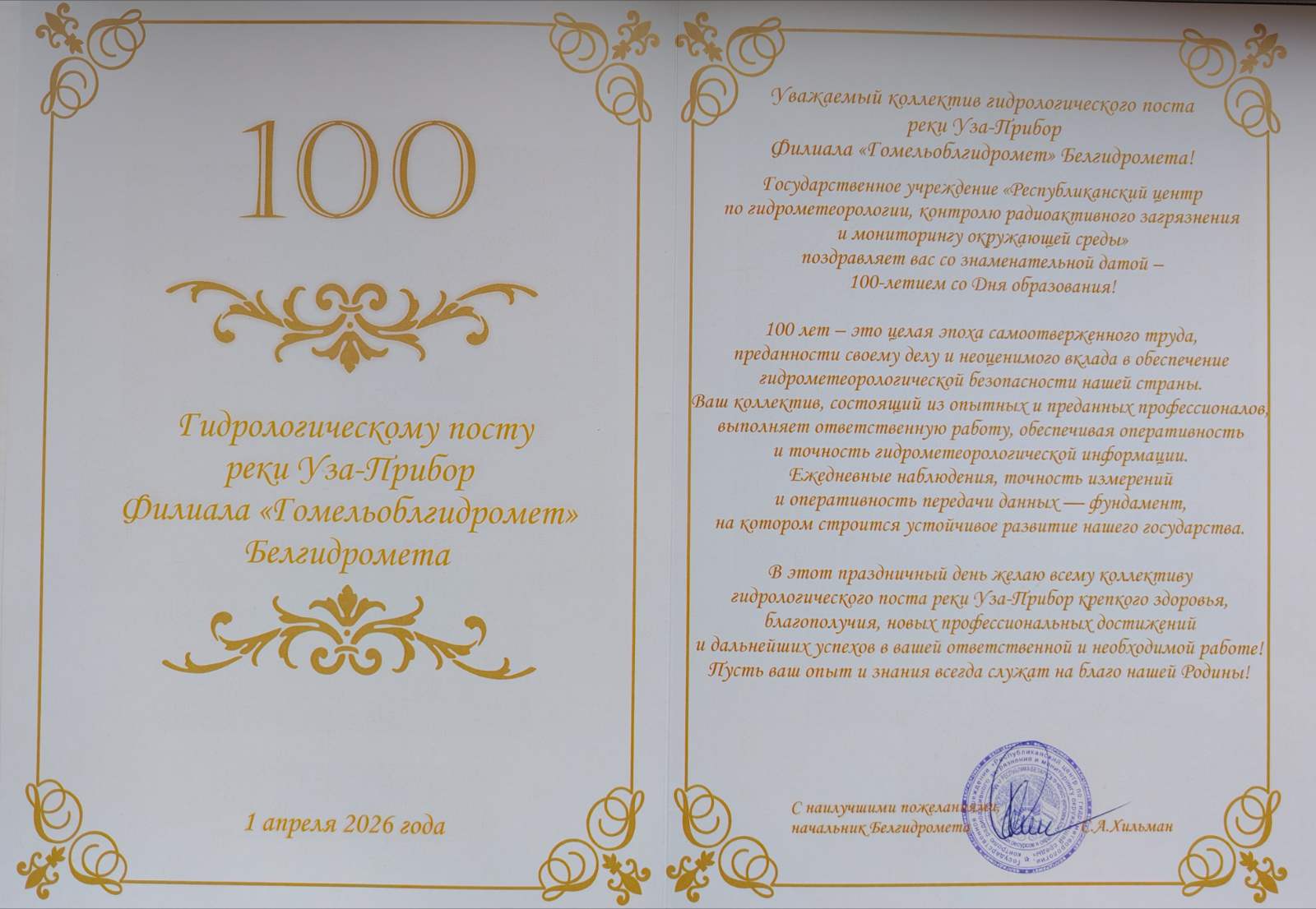 По случаю 100-летия со дня образования гидрологического поста р. Уза-Прибор руководство Белгидромета направило приветственный адрес коллективу поста, в котором поздравило его с этой знаменательной датой, отметив опыт и профессионализм работников, их вклад в обеспечение гидрометеорологической безопасности нашей страны, и высказало тёплые пожелания здоровья, благополучия, успехов!
