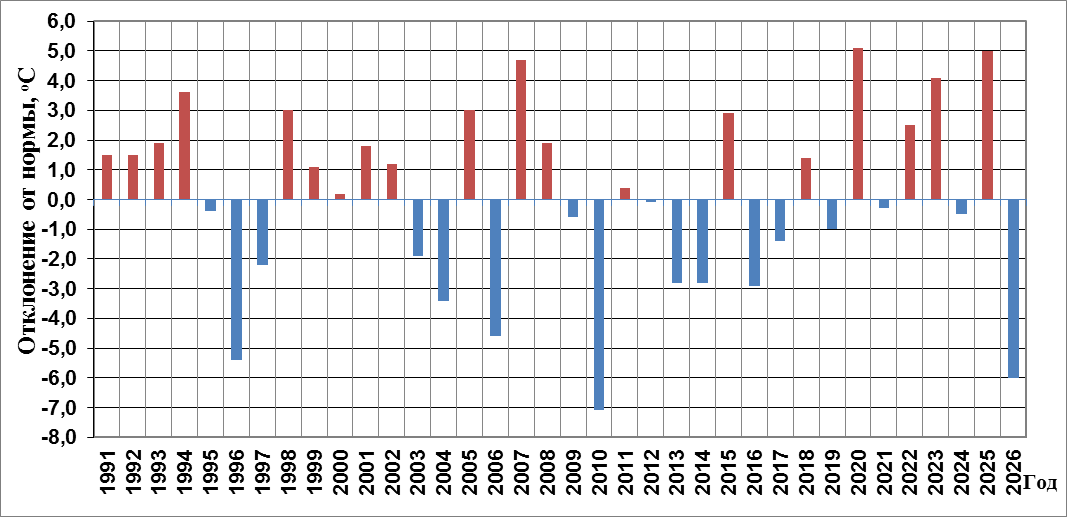 Отклонение средней температуры воздуха января от климатической нормы по Гродненской области за период 1991-2026 гг.