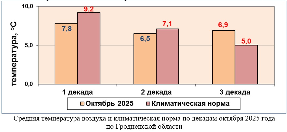 В среднем по области температура воздуха первой и второй декады месяца была ниже нормы на 0,6…1,4°С. Наиболее теплой выдалась третья декада октября с положительной аномалией 1,9°С.