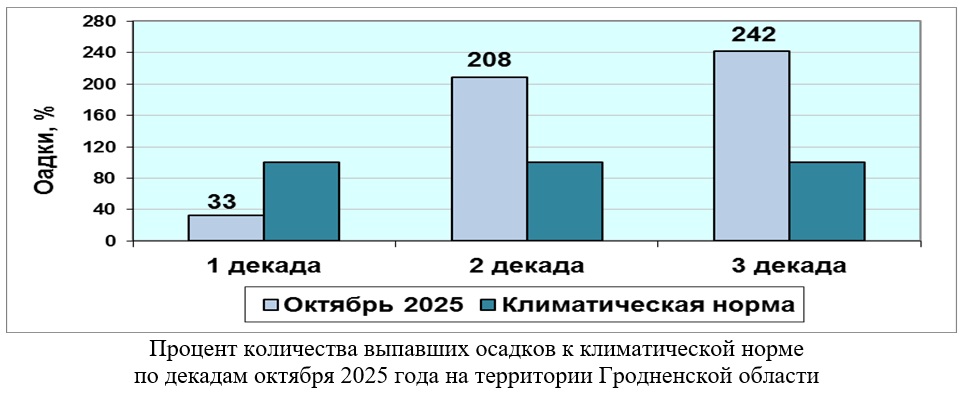 В первой декаде октября отмечался дефицит осадков: выпало всего 33% декадной нормы. Значительный переизбыток отмечался во второй и третей декаде, выпало 2-2,5 нормы.