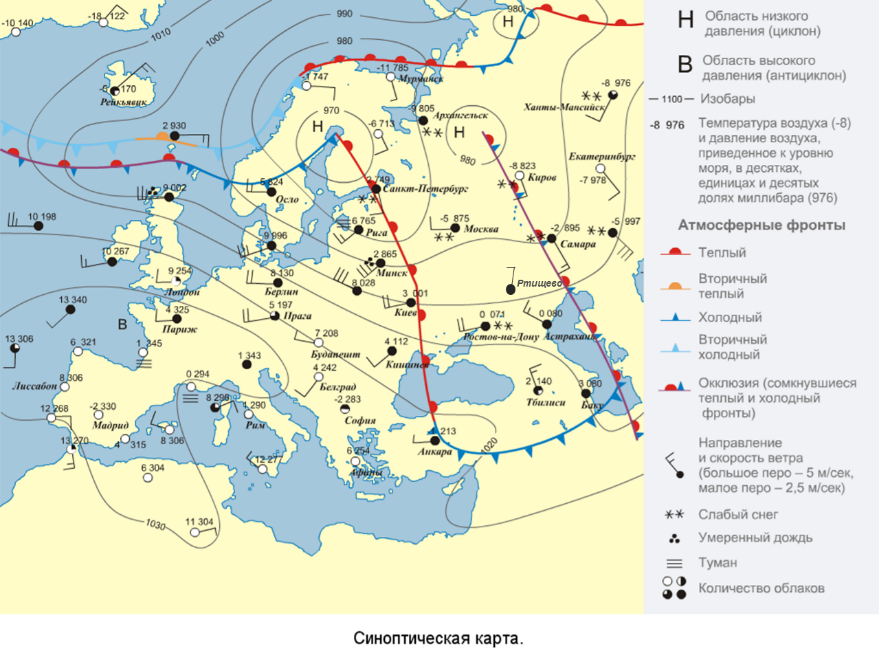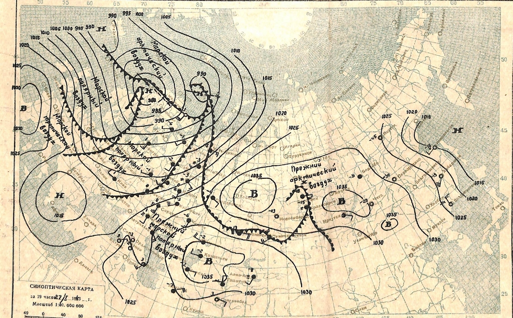 Синоптическая карта – это один из важнейших инструментов в работе синоптиков. На карте, на которой нанесены данные приземных метеорологических станций наблюдательной сети, специалисты могут видеть циклоны, антициклоны, характеристики погоды и воздушных масс. Раньше данные наносились вручную, синоптики «поднимали» карту разноцветными карандашами, проводили линии равного давления, очерчивали области осадков и других атмосферных явлений, рисовали линии атмосферных фронтов: красным цветом - теплые, синим - холодные.