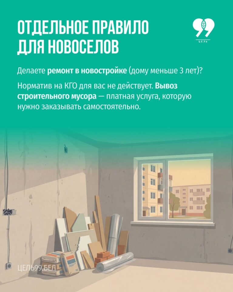 Делаете ремонт в новостройке (дому меньше 3 лет)? Норматив на КГО для вас не действует. Вывоз строительного мусора – платная услуга, которую нужно заказывать самостоятельно.