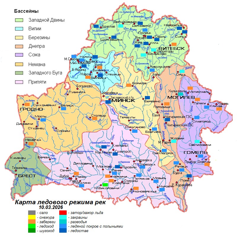 По состоянию на 10 марта на реках бассейна Западной Двины, Днепре, Соже, большем протяжении Березины, Припяти, на отдельных участках Немана, Вилии, а также на некоторых их притоках наблюдается ледостав, ледостав с полыньями и разводьями (толщиной 12-33 см), местами лед подняло, на отдельных участках рек отмечается ледоход.