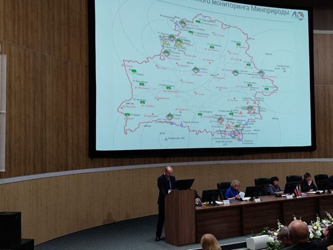 С докладом «Система радиационного мониторинга и контроль населённых пунктов и объектов на территории Республики Беларусь» выступил начальник службы радиационного мониторинга Белгидромета Олег Дюбайло.
