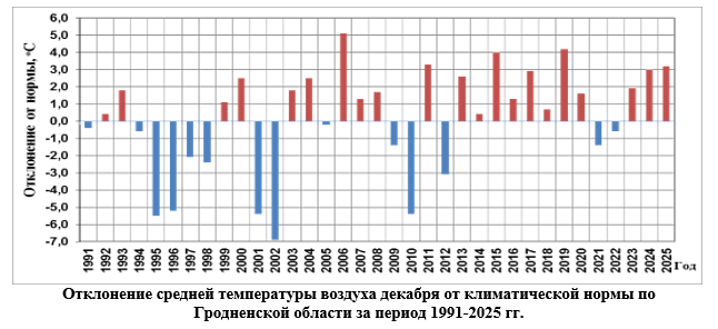 Средняя по Гродненской области температура воздуха за декабрь составила +1,2°С, что на 3,2°С выше климатической нормы.